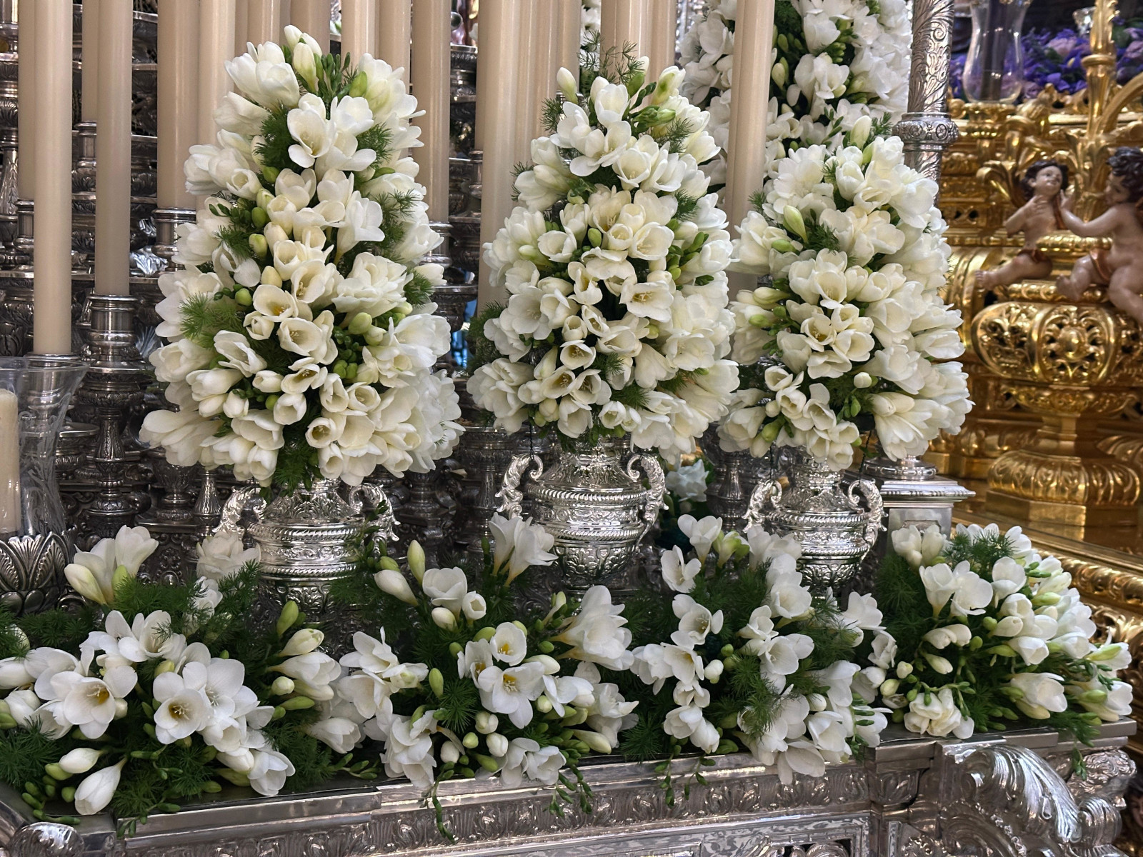 Por su parte, Nuestra Señora de las Angustias porta la antigua Corona de plata sobredorada del año 1953, cuyo autor fue el orfebre cordobés Francisco Millán Gordillo y la saya bordada en terciopelo negro de Fernández y Enríquez de Brenes.